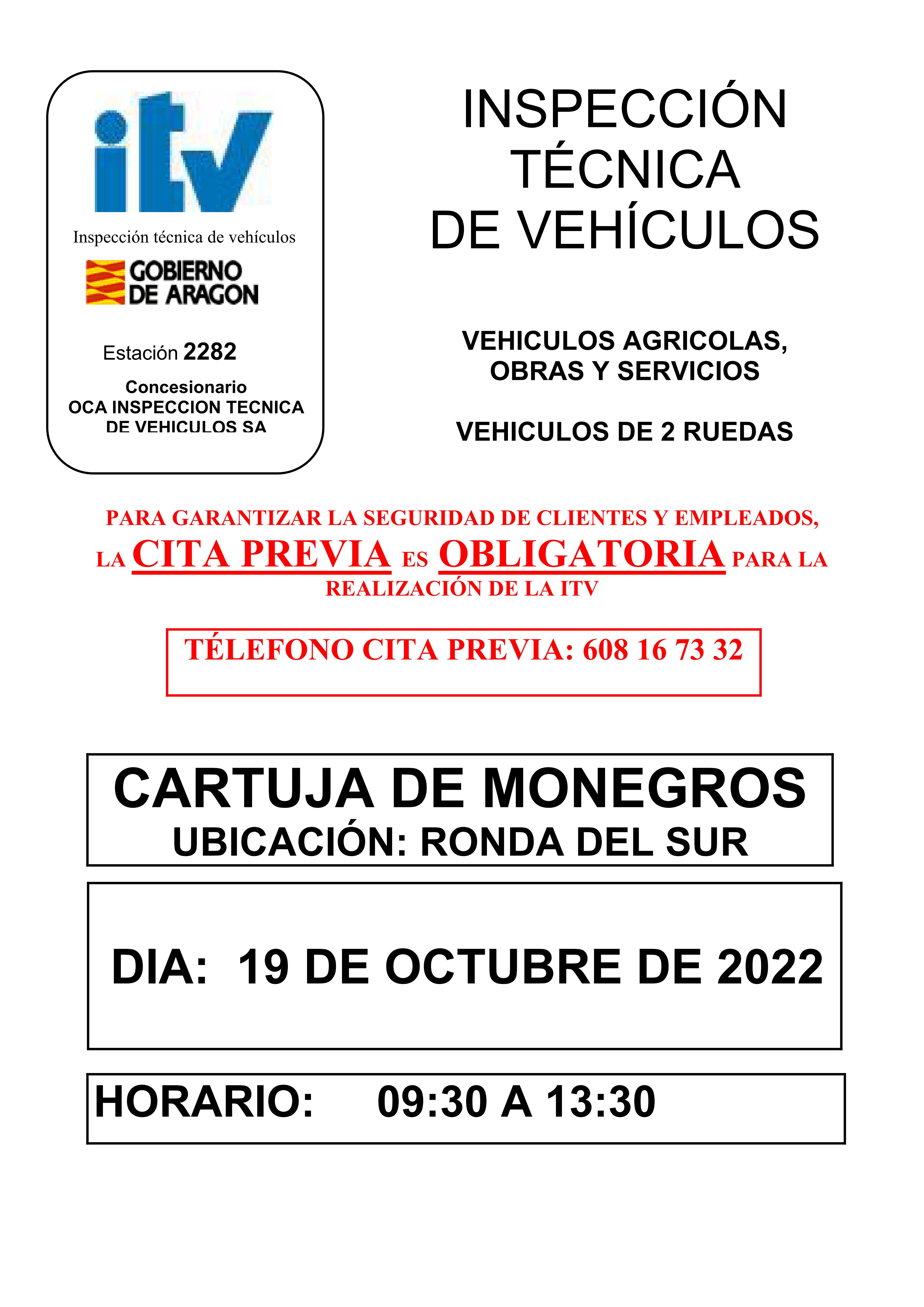 Inspección Técnica de Vehículos Octubre Whatsapp: Inspección Técnica de Vehículos Octubre Fecha 28 septiembre 2022 Inspección Técnica de Vehículos Cartuja de Monegros. Teléfono cita previa: 608 16 73 32 Ubicación: Ronda del sur Dia: 19 de octubre de 2022 Horario: 9:30 a 13:30 Documentos CARTEL AGRICOLA CARTUJA DE MONEGROS (pdf 14,6 kB)