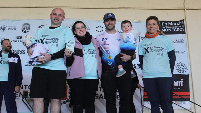 Al finalizar la prueba, como cada año, se han entregado varios reconocimientos simbólicos, entre ellos a la persona de mayor edad y a la más joven en completar el recorrido. La participante más veterana ha sido Julia Calavia, de Cartuja de Monegros, con 83 años, mientras que el dorsal más pequeño lo ha recogido Iker Amat, de Sariñena, con tan solo tres semanas de vida.