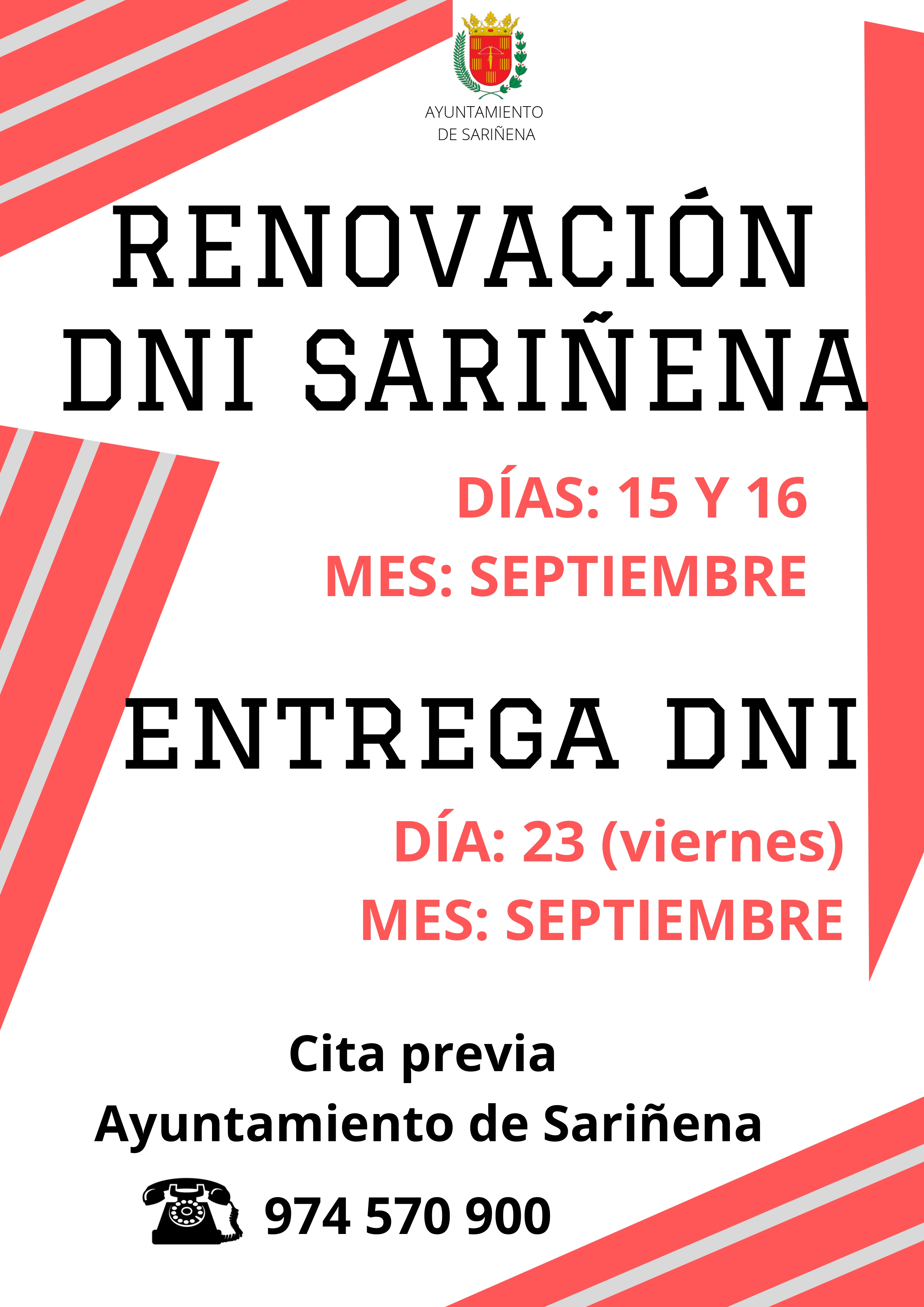 Renovación DNI en Sariñena Whatsapp: Renovación DNI en Sariñena Fecha 08 julio 2022 Para inscribirse, cita previa llamando al Ayuntamiento de Sariñena 974 570 900 Galería imágenes