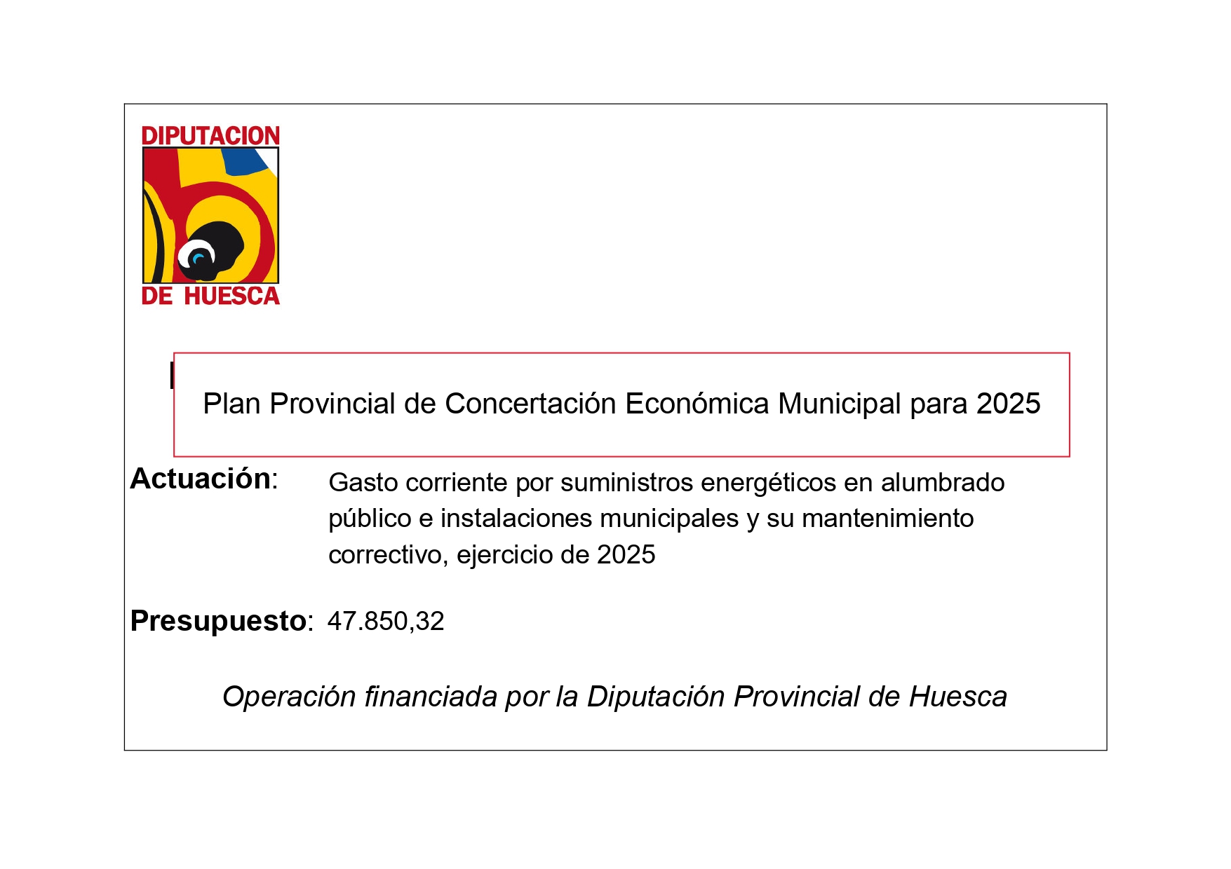La cuantía asciende a 47.850,62 euros dentro del programa de “Suministros Energéticos, Instalaciones y Mantenimiento Correctivo”. El Plan Provincial de Concertación Económica tiene como objetivo reforzar la autonomía de los ayuntamientos para financiar servicios esenciales y necesidades municipales, como el mantenimiento de infraestructuras y la mejora de servicios básicos, contribuyendo el desarrollo sostenible y equilibrado del territorio altoaragonés.
