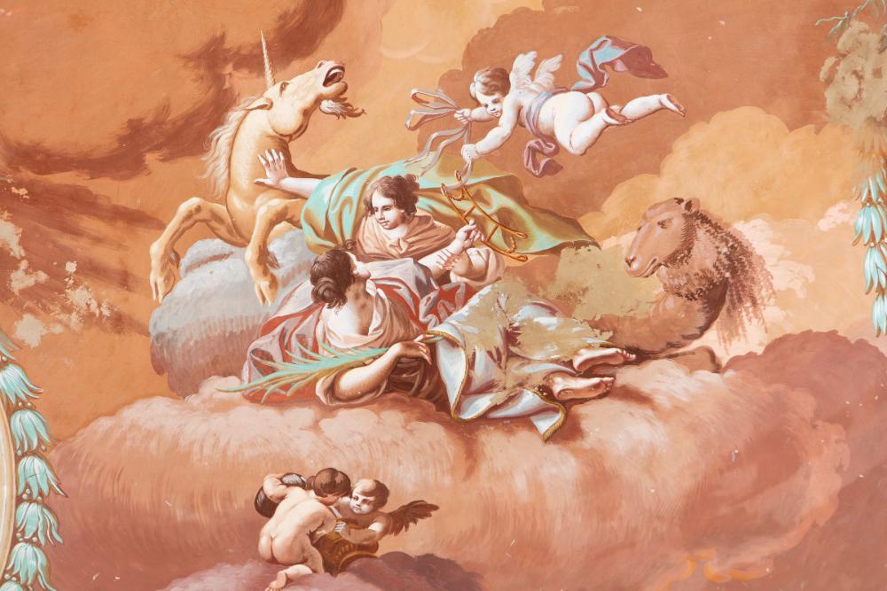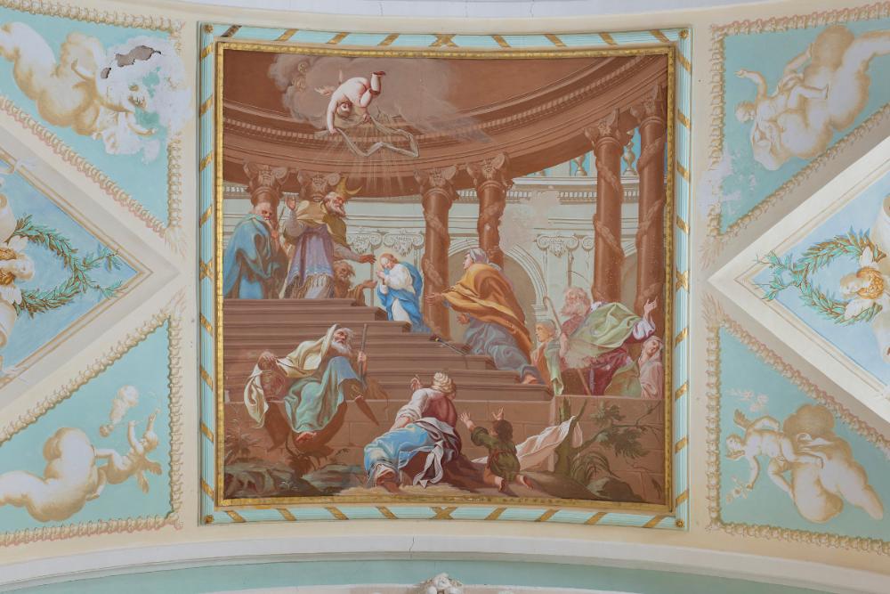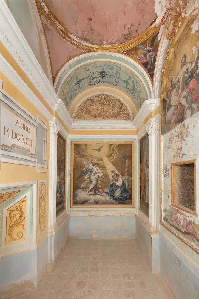 Precisamente por esta sencillez llama todavía más la atención el interior de la iglesia, decorada con alrededor de 2000 metros cuadrados de frescos de fray Manuel Bayeu, cuñado de Goya. Se trata de 250 composiciones independientes, todas sobre la vida de la Virgen, las cuatro mujeres del Antiguo Testamento y las cuatro virtudes cardinales. Por ello, y por su intenso sentido escenográfico, suponen una de las más vastas e importantes obras murales del siglo XVII en Aragón.