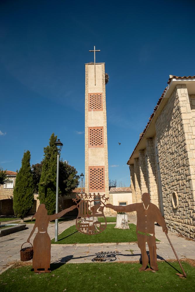 El centro del pueblo lo constituye la plaza, elevada con respecto al resto de calles y porticada, donde se ubican los principales espacios y edificios públicos en torno a una zona ajardinada. La iglesia sigue la misma estética que el resto de edificaciones de la localidad, usando la piedra como elemento tradicional, a los que suma las vidrieras de colores, típicas de la década de 1960, como elemento contemporáneo.